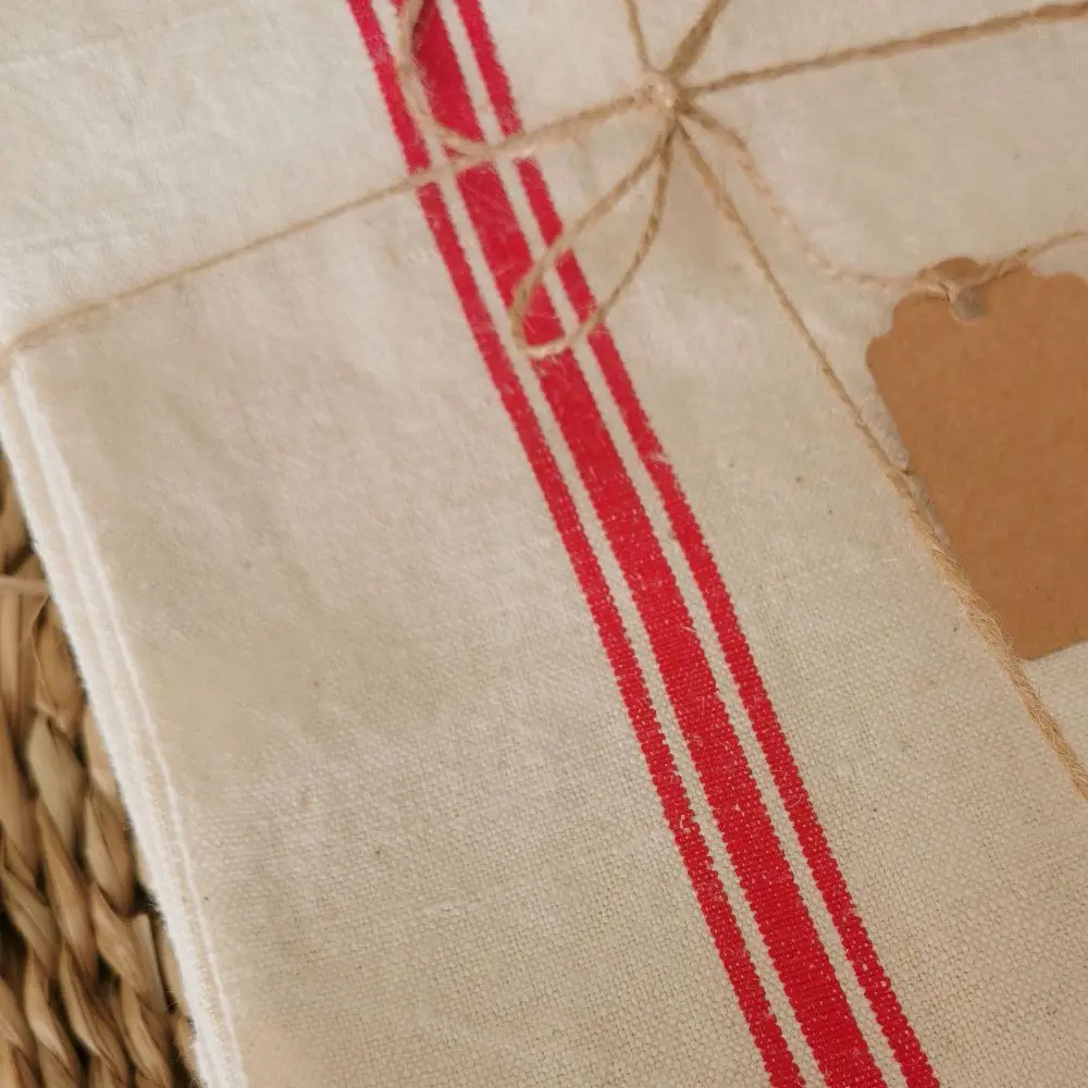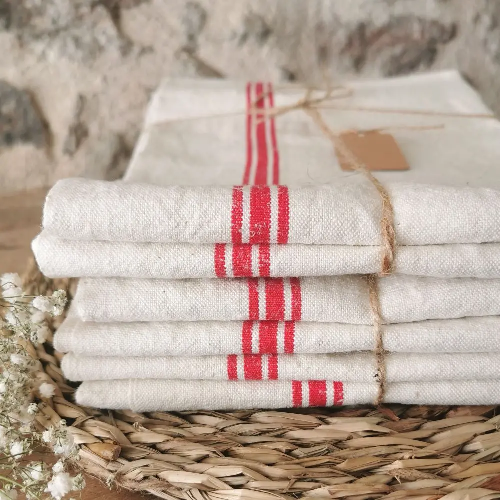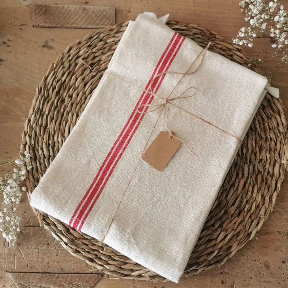 On adore leur jolie toile tissée d’un blanc légèrement écru, décoré de 3 liteaux rouges.